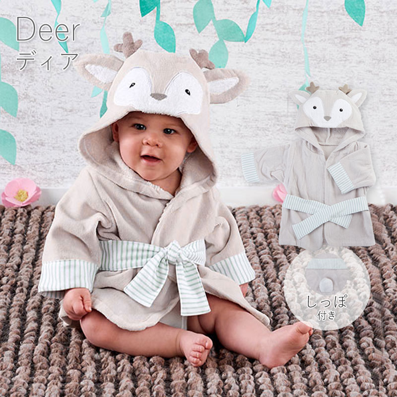 海と陸の生き物や架空の生き物をモチーフにしたベビー用のバスローブは、お風呂上りの小さなベビーを可愛く包み込んでくれます。