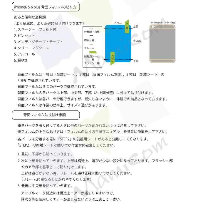 背面保護フィルムは構造上、iPhone6に最適にフィットさせる設計になっており、3シートで1セットとなっております。