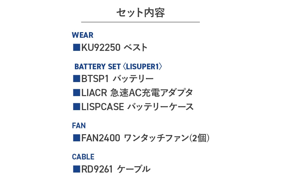 品番 SKSP01空調服(R)パワーファンスターターキット シーズン 春夏用 バッテリースペック BTSP1【外寸】高さ89mm×幅85mm×厚さ25mm【出力/連続使用時間】・7.2V/約4.5時間 ・6V/約6時間 ・5V/約9時間 ・3.3V/約23時間【充電時間】約8時間【定格容量】6500mAh(46.8Wh)【重量】274g ファンスペック FAN2400【外寸】厚さ53mm(最大値)【重量】131g【バッテリー設定電圧:風量】・7.2V:30.0ℓ/秒 ・6.0V:25.9ℓ/秒 ・5.0V:22.4ℓ/秒 ・3.3V:16.0ℓ/秒 急速ACアダプター LIACR【充電時間】約8時間 カラー(全1色) 5 ブラック×ブルー その他説明・特長 とにかく涼しく!パワーを求める方向け ・暑さに応じて4段階の風量切り替え可能・(パワーファン3.3V設定時)最長23時間連続使用の大容量・屋外作業に優れた赤色LED表示およびワンボタン簡単操作・高い安全性を確保したJIS IP55(防塵防水)規格適合 注意点 ▼モニター発色の具合によって、多少実際のものと色合いが異なる場合がございます。