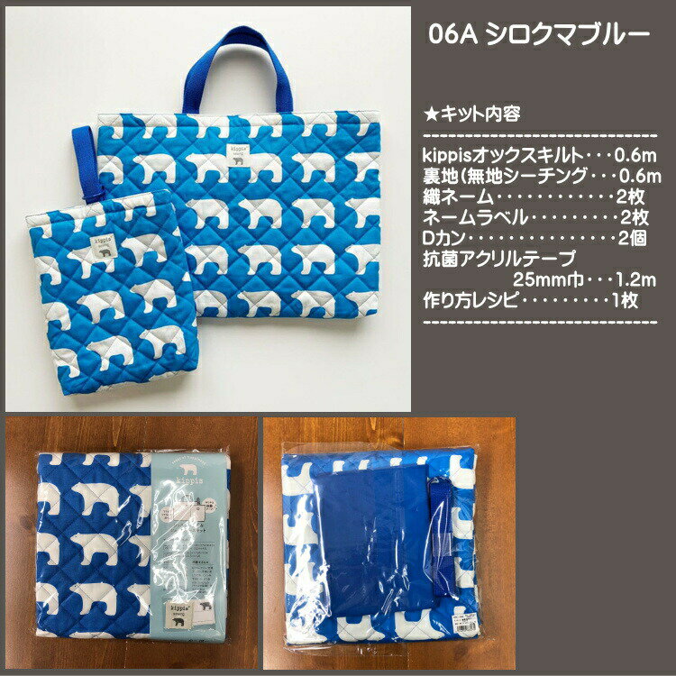 キット内容 kippisキルト生地 約55cm巾×120cm シーチング生地(裏用) 約110cm巾×60cm オリジナルネームラベル 2枚 オリジナル織ネーム 2枚 抗菌アクリルテープ 25mm巾×1.2m Dカン 1個 作り方レシピ 1枚 ★