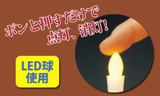 LEDろうそくは、アルカリ乾電池使用で長時間の連続点灯が可能!炎部分がスイッチになっており、炎を押すことで点灯・消灯ができます。