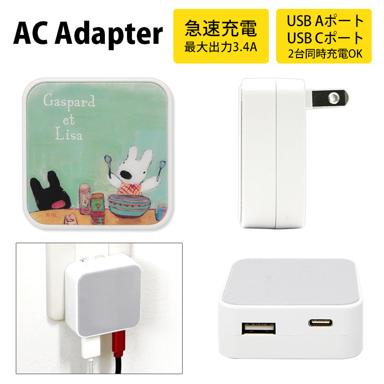 リサとガスパール AC アダプタ 2台同時充電可能 USB タイプC typeC アダプター コンセント 3.4A スマホ タブレット ゲーム機 充電器 キャラクター グッズ リサガス オシャレ かわいい 大人女子 綺麗 水色 ライトブルー